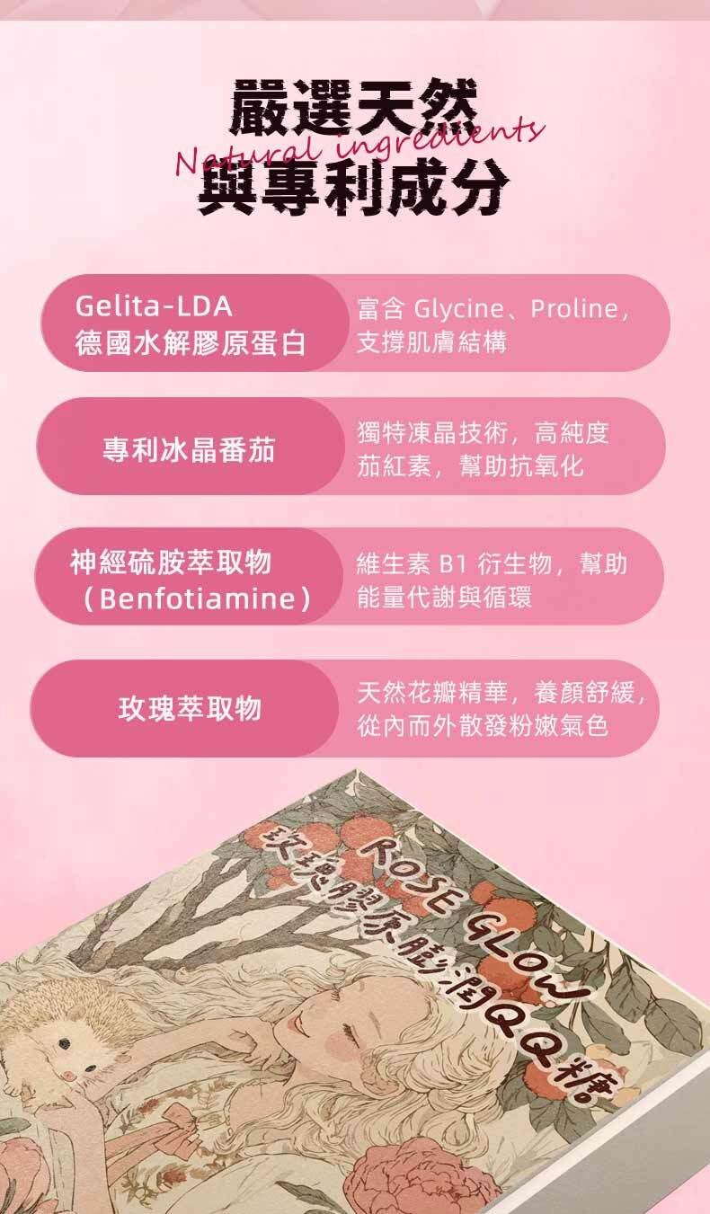 • 嚴選高品質膠原蛋白與天然玫瑰精華